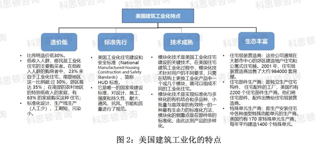 而美国的住宅用构件和部品的标准化、系列化、专业化、商品化、社会化程度很高;从美国实际的产业情况来看,由于工厂化生产的装配式住宅与建筑的部构件及其组件,每平方英尺造价比传统方式低 30%-50%。以 1997 年数据为例,当年新建 147 万套住宅,其中工业化住宅113万套,占比 77%。